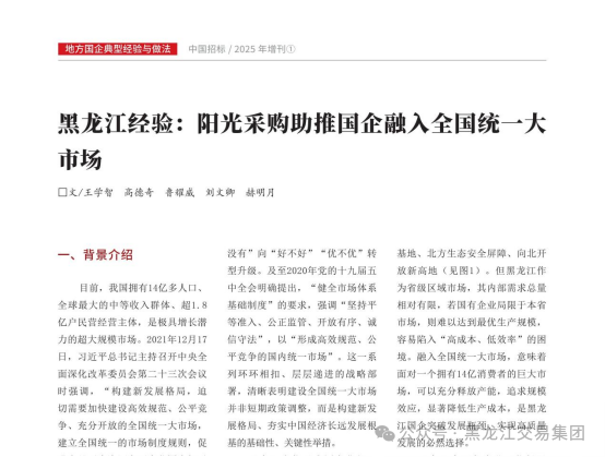 新闻中心 > 子公司动态近日,黑龙江阳光采购服务平台在《中国招标》期刊发表了题为《黑龙江经验:阳光采购助推国企融入全国统一大市场》的文章。在全国统一大市场建设不断取得新进展、实现新突破的背景下,阳光采购服务平台也在激发龙江国企活力,特别是在国有企业采购领域,交出了自己的答卷。