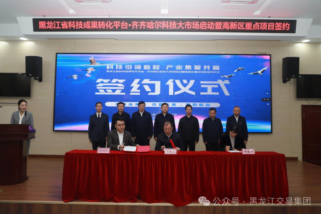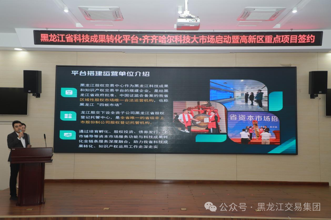 前期,为助力哈大齐自创区建设、培育和发展新质生产力,黑龙江股权交易中心与齐齐哈尔市高新区管委会、齐齐哈尔市科技局充分协同,高效联动,在成果转化、招商引资、上市培育等领域有诸多成果落地,各方携手共建黑龙江科技成果和知识产权交易平台齐齐哈尔分平台、齐齐哈尔科技大市场。齐齐哈尔科技大市场充分整合政策、资本与产业资源,推动省级平台资源与齐齐哈尔“2345”现代化产业体系深度融合,致力打造区域性全要素科技创新服务基地,通过“政府引导、市场运作、资源协同”的创新机制,构建线上线下结合的“两大载体、五大功能”服务体系,线下实体大市场位于高新区高新智谷展厅,集展示、对接、路演与服务功能于一体;线上分平台由龙江股交搭建,汇聚成果、需求、人才与资本资源,提供评估、交易、融资、孵化全流程服务。