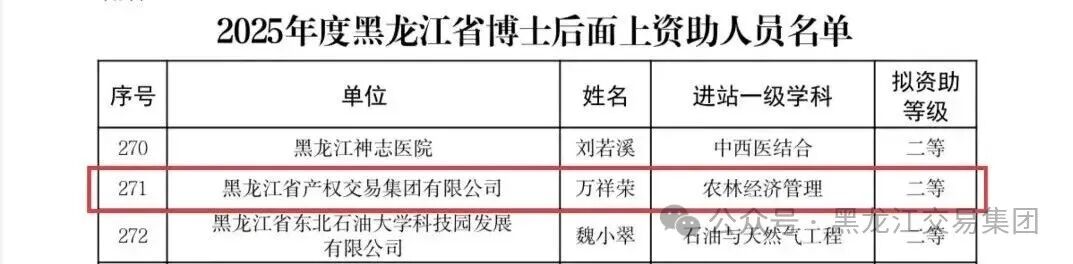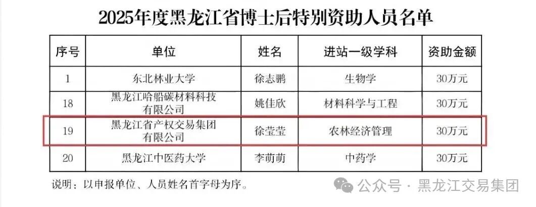 近日,省人社厅公布了2025年度黑龙江省博士后专项经费资助人员名单。交易集团博士后科研工作站在站博士后徐莹莹、万祥荣分别获得2025年度黑龙江省博士后特别资助与面上经费二等资助。