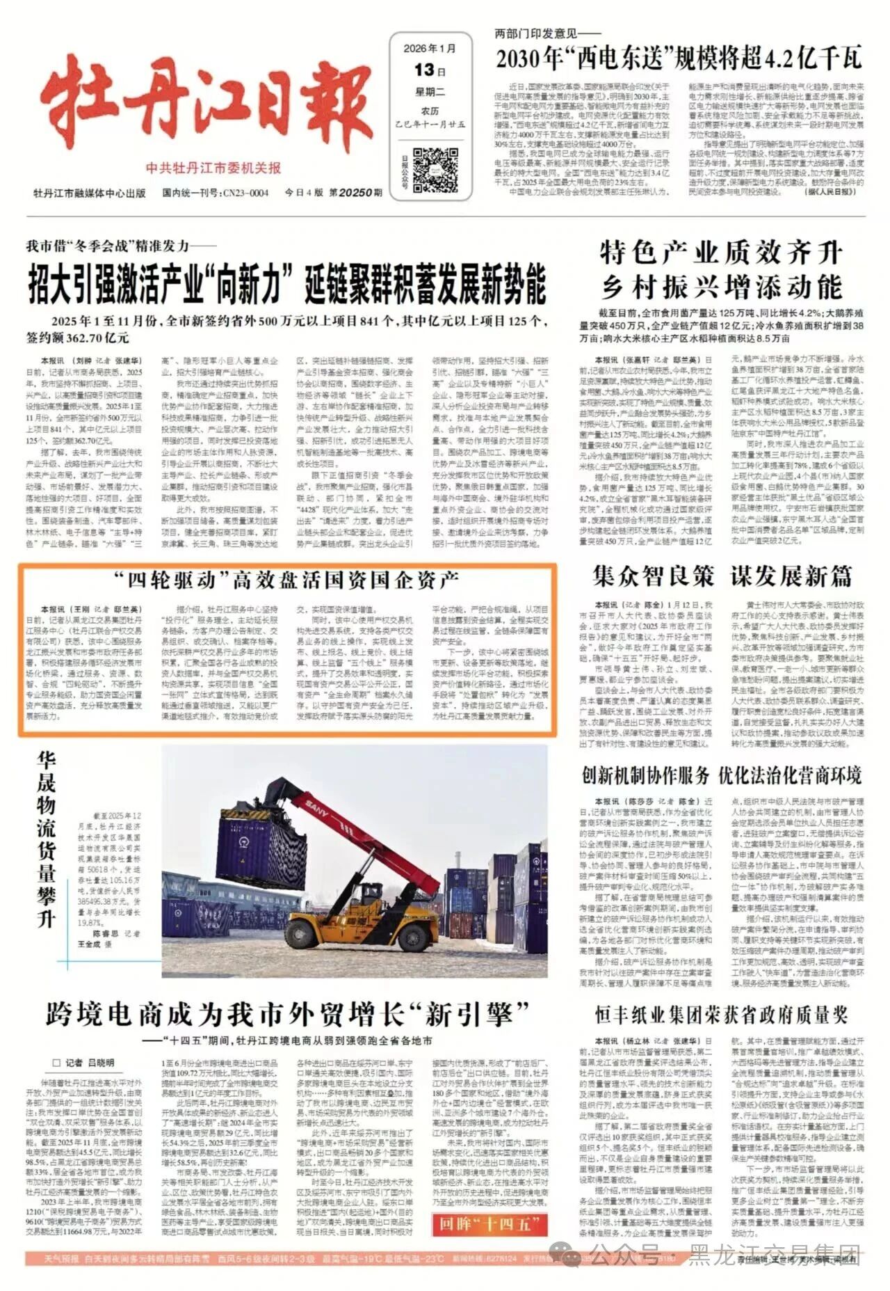 日前,记者从黑龙江交易集团牡丹江服务中心(牡丹江联合产权交易有限公司)获悉,该中心围绕服务龙江振兴发展和市委市政府任务部署,积极搭建服务循环经济发展市场化桥梁,通过服务,资源,数智,合规“四轮驱动”,不断提升专业服务能级,助力国资国企闲置资产高效盘活,充分释放高质量发展新活力。